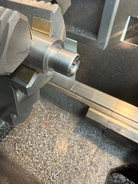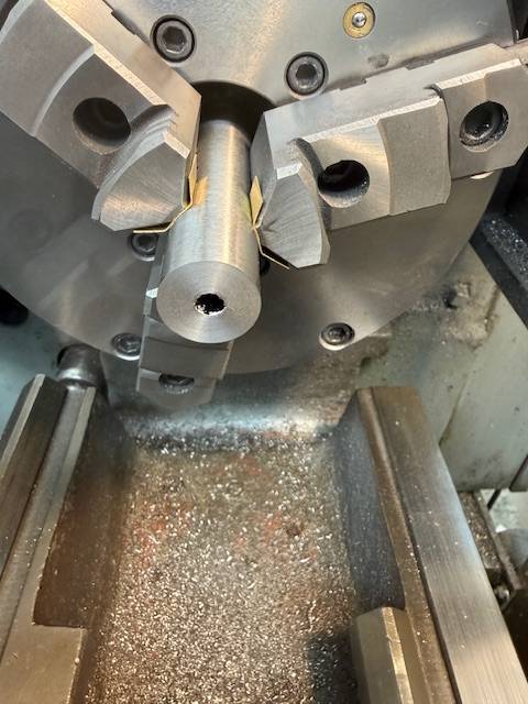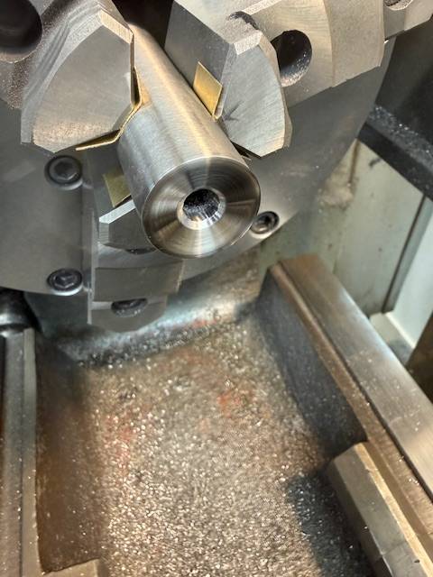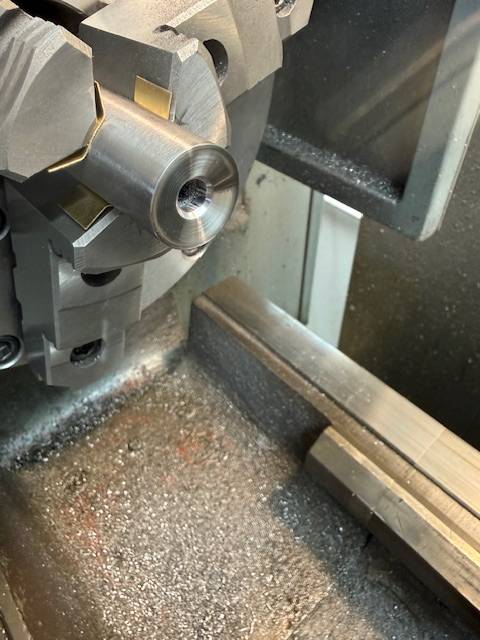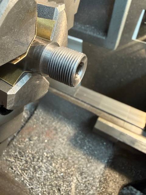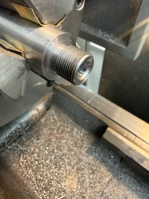 Check out our latest work Photos show the process of finishing the muzzle end of a rifle barrel starting with truing the end then machining a 11 degree crown, then machining a 5/8-24 thread for muzzle devise.